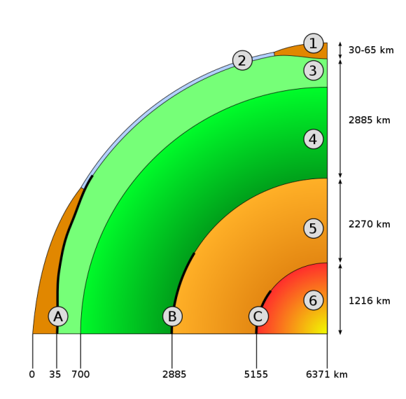 지구 내부 구조와 각 부분의 온도를 나타낸다. 1은 대륙의 지각, 2는 해양의 지각, 3은 맨틀 상층, 4는 맨틀 하층, 5는 외핵이며, 붉게 그려진 6은 내핵을 나타낸다. 각 부분의 두께는 km로 나타내고 있다. 아래의 A,B,C는 각 부분의 온도(℃)이다.