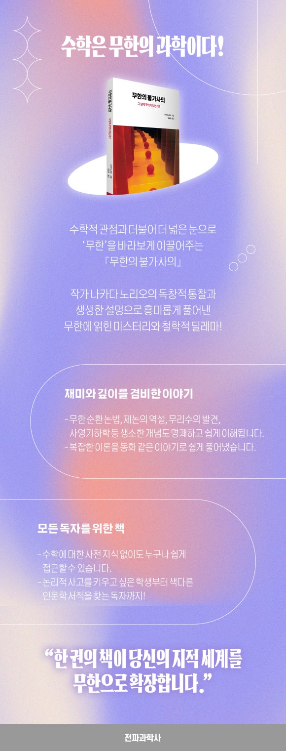 수학적 무한의 개념을 다양한 과학적 관점에서 탐구하며, 일상적인 경험과는 다른 새로운 인식의 세계를 열어준다. 저자는 이 책을 통해 독창적이면서도 이해하기 쉽게 무한에 대한 개념을 설명하며, 이를 철학적 사유와 과학적 논리로 풀어내고 있다. 이 책은 수학이나 물리학적 배경이 없는 독자라도 쉽고 친근하게 접근할 수 있도록 구성되어, 특히 수학의 경이로운 세계에 첫발을 내딛고자 하는 입문서의 역할을 한다.
