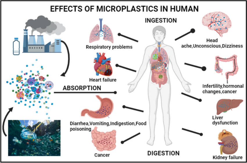 내분비계 교란과 생식 기능을 저하시키기도 한다. 미세플라스틱에는 비스페놀A(BPA), 프탈레이트 등 내분비계 교란 물질이 포함되어 있어 호르몬 시스템에 영향을 미칠 가능성이 있다. 최근 독일 프라이부르크 대학 연구진이 발표한 논문(Journal of Environmental Health, 2024).에 따르면, 미세플라스틱 노출이 남성의 정자 수 감소 및 여성의 생식 기능 저하와 관련이 있다.