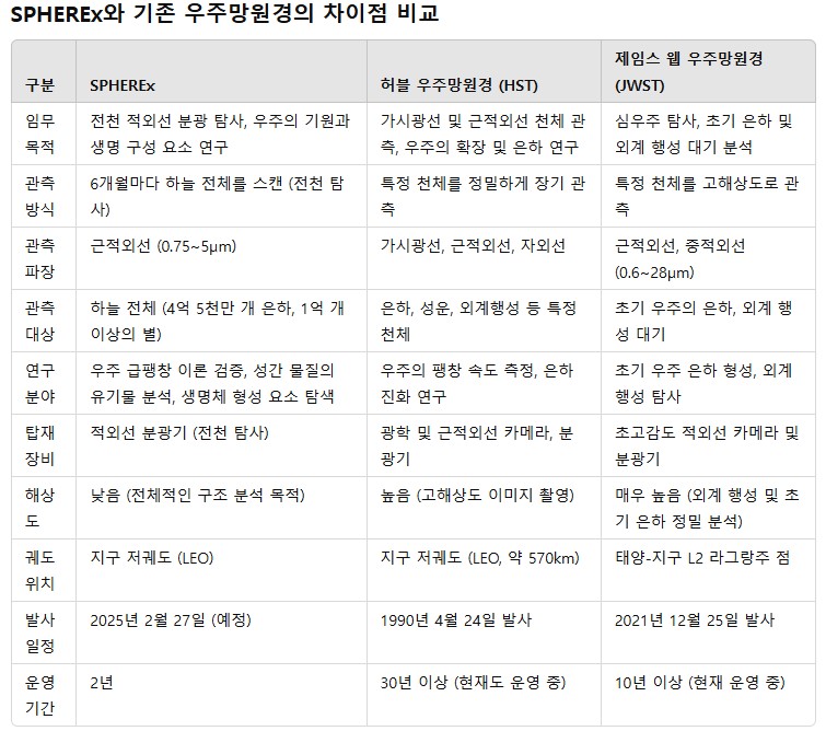 SPHEREx(스피어엑스)는 약 4억 5천만 개의 은하와 1억 개 이상의 우리 은하 내 별들에 대한 분광 데이터를 수집할 예정이다. 기존의 허블이나 제임스 웹 우주망원경이 특정 천체를 고해상도로 관측하는 역할을 했다면, SPHEREx(스피어엑스)는 우주 전반의 구조와 물질 분포를 거시적으로 분석하는 역할을 담당하게 된다.