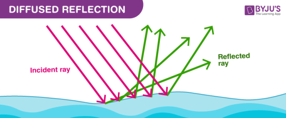 입사광선(붉은색)이 비친 면이 평면이 아니면 빛은 분산된 상태(녹색)로 산란반사(diffused reflection)된다.