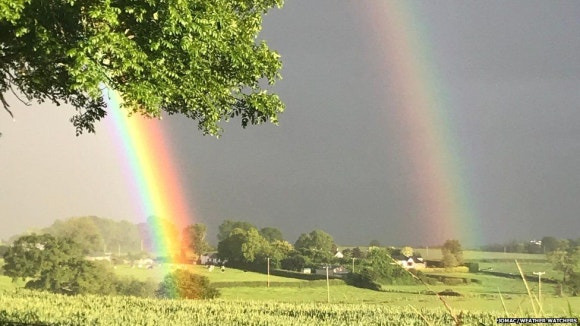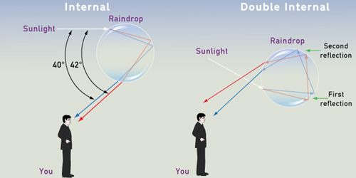 물방울 속에서 이중으로 반사되고(오른쪽) 굴절된 빛은 색의 순서가 바뀌고, 훨씬 흐린 색으로 2차 무지개를 형성한다.