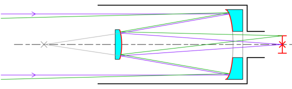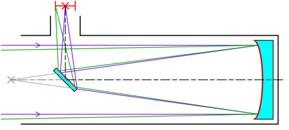 카세그레인식 반사망원경은 2차거울이 경통의 중앙에 있으므로, 망원경으로 들어오는 빛을 굴절망원경처럼 망원경 뒤쪽에서 관측할 수 있다. 이런 망원경은 반사경(주경主鏡)의 중앙에 구멍을 뚫어 접안경으로 빛이 나오게 한다.