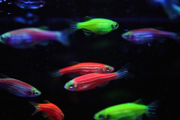 제브라피시는 인도가 원산지인 인기 있는 작은 열대어의 일종이다. 미국의 글로피시(GloFish)사는 제브라피시에 형광을 내게 하는 유전자를 집어넣어 다양한 색을 내는 형광 제브라피시를 만들어냈다. 위 사진은 자연의 제브라피시이고, 아래는 형광 제브라피시이다.