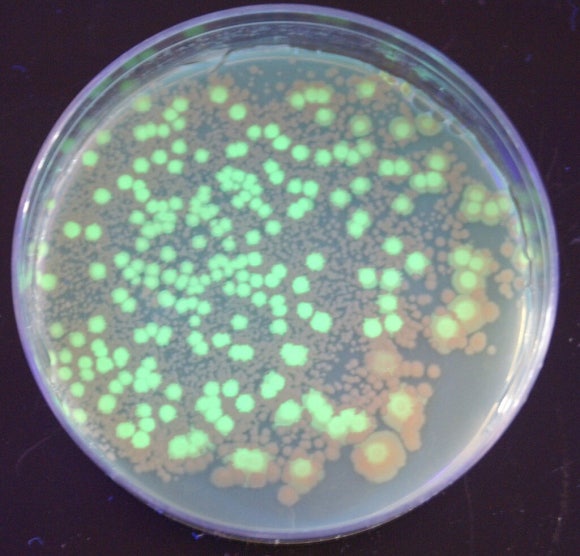 박테리아 종류는 실험실의 시험관 속에서 대량으로 간단히 배양할 수 있고, 몇 시간 또는 며칠 사이에 분열하여 빠르게 증식한다. 그러므로 과학자들은 박테리아를 이용하여 다양한 GMO를 쉽게 만들고 있다. 위 사진은 자연 대장균이고, 아래는 형광 단백질을 생산하는 유전자를 삽입하여 만든 형광대장균 GMO이다.