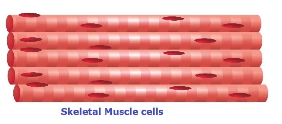 5. 근육세포(근세포) - 운동을 하는 근육조직의 세포이다. 신축(伸縮)을 하는 근육세포는 액틴(actin), 마이오신(myosin) 같은 단백질을 많이 가지고 있다. 세포는 길고 큰 편이다. 근육세포는 골근육세포(골격근), 심근(心筋), 평활근(平滑筋) 3종류가 있다.