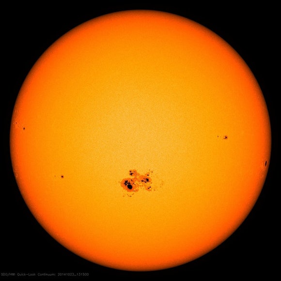 태양 표면 320,000km에 걸쳐 커다란 흑점 몇 개가 발생해 있다.