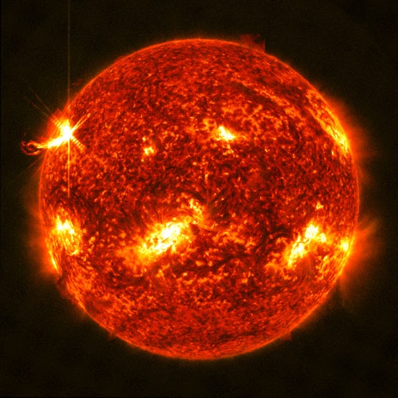 극대기가 되면 자기장이 강력해져 표면에서 이온(전자와 양성자)들이 대량 쏟아져 나온다. 이것을 태양 플레어(solar flare)라 한다. 태양 플레어의 폭발 위력은 수백만 개의 화산이 동시에 터지는 에너지와 비슷하다. 태양 플레어는 빛의 속도로 이동하여 지구까지 8분이면 도착한다. 이 사진은 NASA가 2023년 1월에 태양관측선으로 포착한 태양 플레어이다.