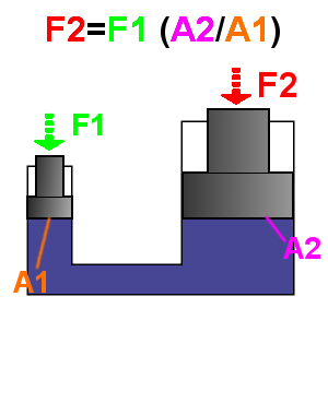 그림에서, A2의 면적이 A1보다 10배 넓은 경우, A1에 F1의 힘이 작용한다면, (같은 면적에 같은 힘이 작용하므로) A2에는 10배의 힘이 작용하게 된다. 즉 A2에 자동차를 얹어두었다면, A1에서 약간의 힘만 주어도 자동차를 쉽게 들어 올릴 수 있게 된다. A1이 자동차의 브레이크 페달이라면, A2는 큰 힘으로 바퀴의 회전을 멈추도록 마찰력을 작용시키는 부분(디스크)이다.