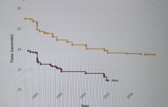 50m 수영경기 기록을 보면, 이 경기가 시작된 1970년대 이후 남녀 모두 3초 정도 빨라졌다. 이 그래프를 보면, 2008-2009년 사이에 남녀 모두 기록을 갱신하고 있다. 이때의 기록은 수영복 때문에 나타났다. 즉 부력이 좋은 섬유로 수영복을 만들었기 때문이었다. 이후 부력이 적용된 섬유로 만든 수영복은 착용이 금지되었고, 이후 기록은 단축되지 않고 있다.