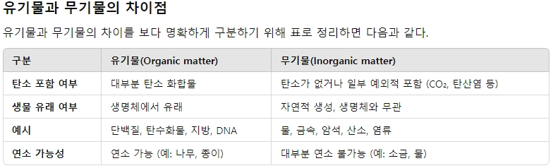 이는 유기물이 타면서 산소와 결합하여 CO₂를 방출하는 과정이다. 반면, 모래(규소), 철, 돌을 태운다고 해서 이산화탄소가 발생하지 않는다. 이는 무기물이라는 증거다.