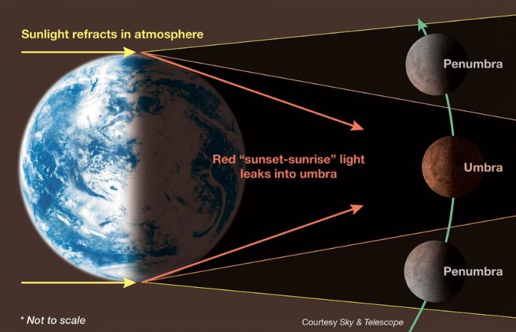 지구에 대기가 없다면, 개기월식 동안 달은 완전히 검게 보일 것이다. 그러나 태양빛 중 일부가 지구의 대기를 통과하며 굴절되어 지구의 본그림자(엄브라) 안으로 들어오게 되며, 이로 인해 개기월식 동안 달의 표면이 붉은빛을 띠게 된다. [자료= Sky & Telescope]