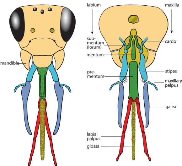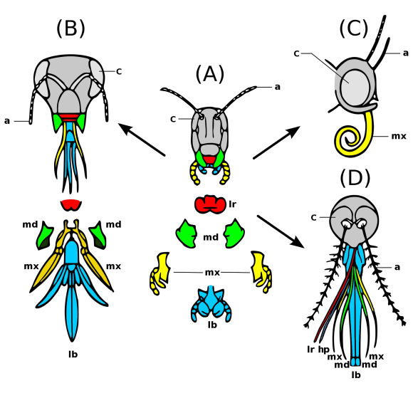 그림에서 a: 안테나, c: 복안, lb: 입술, lr: 윗입술, md: 턱(악顎), mx: 위턱(상악上顎), hp: 아래 혀(hypopharynx)