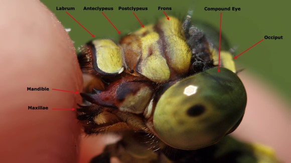 잠자리 주둥이는 좌우에 강력한 맨디블이 있고, 그 아래에 작은 턱(maxillae)이 있다. labrum(윗입술)은 먹이를 삼키는 역할을 한다.