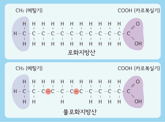 포화지방산은 글리세롤의 탄소 분자가 4개의 다른 분자와 연결된 지방산을 의미하고, 불포화지방산은 탄소가 2개(이중결합) 또는 4개와 연결되어 있어 결합 형태에 빈자리가 있는 지방산을 의미한다.