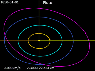 중앙의 황색 점은 태양, 노란 선은 토성의 궤도이다. 이 컴퓨터 에니메이션 영상에서 붉은 선으로 나타낸 명왕성(Pluto)은 해왕성(청색 선) 바깥 궤도를 돌다가 일시적으로 천왕성(녹색 선)과 해왕성 사이를 지나간다. 천왕성과 해왕성 사이의 공간이 카이퍼 벨트이다. 이 영상의 궤도에서 사선이 그려진 공간은 명왕성이 황도면 궤도로부터 약간 기울어져 1850년부터 2097년까지 지나가는 궤도의 범위를 나타낸다.