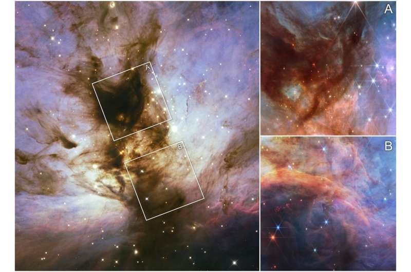 이 이미지는 불꽃 성운을 허블 우주 망원경(왼쪽)과 제임스 웹 우주 망원경(오른쪽)으로 촬영한 근적외선 관측 비교 사진이다. 웹 망원경의 이미지는 성운 내부의 젊은 별과 갈색 왜성을 더 자세히 보여준다.