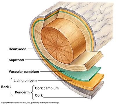 목재 중심부의 죽은 세포는 심재(心材 heartwood)라 하고, 수피 주변의 세포는 변재(邊材 sapwood)라 한다. 邊은 주변, 변두리라는 뜻이다. 심재가 되는 물관세포와, 주변을 둘러싼 체관세포를 형성하는 부분(녹색 표시)을 형성층(形成層 cambium) 또는 부름켜(켜켜이 불어나게 하는)라 한다.