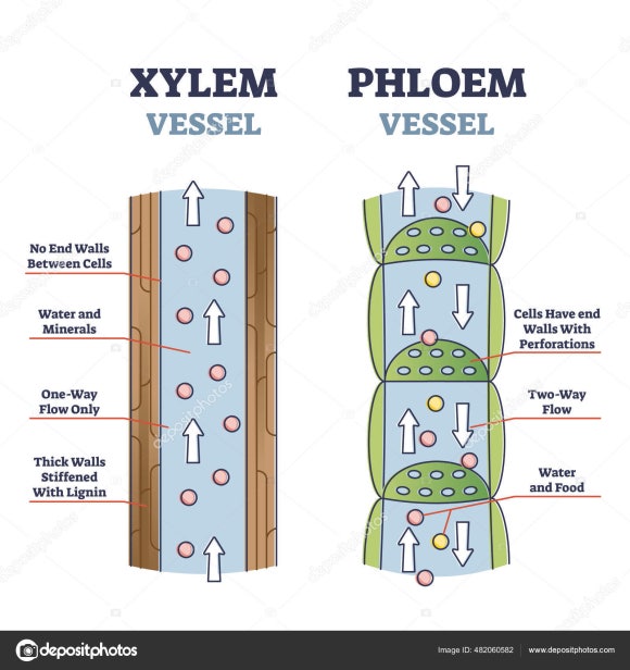 물관(xylem vessel)과 체관(phloem vessel)의 구조를 비교한다. 물관과 체관은 뿌리에서부터 모든 잎 끝까지 튜브를 이루고 있다. 이 튜브는 주변의 세포들이 에워싸서 만든 통로이다. 체관은 이 튜브 중간을 가로 막은 판에 구멍이 가득 뚫려 있다. 물관으로는 물이 위로한 방향으로만 운송되지만, 체관으로는 영양물질이 필요에 따라 반대방향으로도 이동한다.