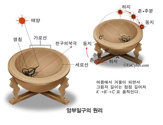 조선시대의 앙부일구는 시계판의 원형 홈에 그림자가 생기도록 설계되었다. 그림자가 홈의 특정 위치를 지날 때의 시간을 알 수 있도록 되어 있다.
