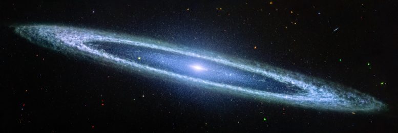 2024년 11월, 제임스 웹 우주망원경이 포착한 솜브레로 은하. 은하 외곽 고리의 먼지가 고르게 퍼진 것이 아니라, 불규칙하고 덩어리진(clumpy) 구조를 이루고 있음이 드러났다. 중적외선 빛은 솜브레로 은하 외곽 원반에서 진행 중인 별 형성 과정과 관련된 가스와 먼지를 강조해 보여준다. 이 은하의 고리에서는 매년 태양 질량 기준으로 1개 미만의 별이 형성되며, 이는 우리은하의 연간 평균 별 생성률(약 2개)의 절반 수준이다.