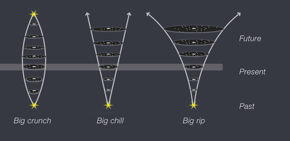 우주는 언제 어떻게 시작되었는가? 지구의 생명체는 언제 어떻게 나타났을까? 인류의 문명은 언제 어떻게 탄생하게 되었을까? 인류가 수백 년 동안 가져온 ‘시작’에 대한 대표적 의문의 일부이다. 우주의 미래에 대한 공통된 이론은 아직 없다. 아득히 먼 별과 은하들을 관찰해온 일부 천체물리학자들은 우주의 미래를 아래 그림처럼 3가지로 예상한다.