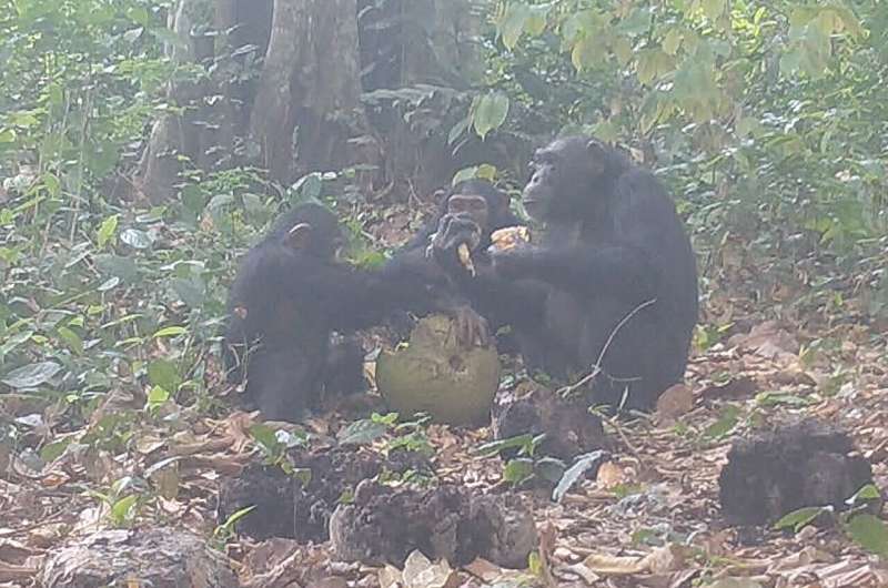 야생 침팬지들이 자연 발효된 과일을 함께 나누어 먹는 모습이 카메라에 처음으로 포착됐다. 이는 침팬지들이 집단 내 관계를 다지는 사회적 상호작용의 일환일 수 있음을 보여준다.