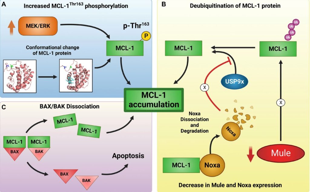 MEK/ERK 신호를 통해 안정화되거나, USP9x 효소의 도움으로 분해를 피하면서 세포 안에 축적된다.