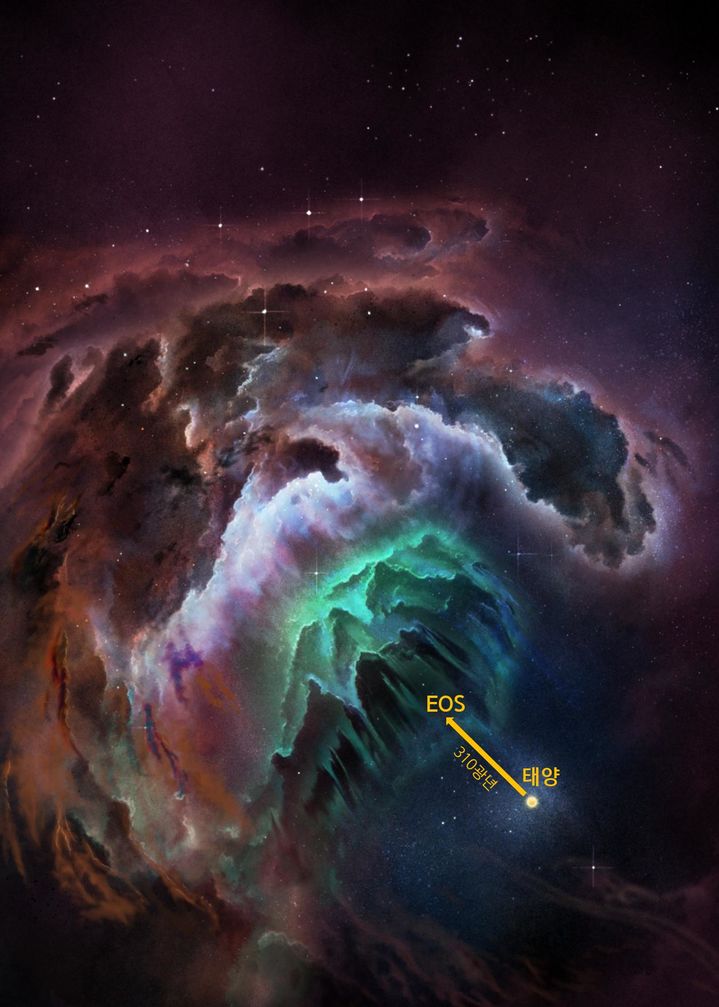 사진에는 태양에서 약 310광년 떨어진 위치에 존재하는 분자운 ‘EOS’의 공간적 위치가 표시돼 있다. EOS는 우리 은하 내에서 별이 태어나는 재료인 분자 가스가 밀집된 영역으로, 이번 관측을 통해 태양에 가장 가까운 분자운으로 처음 확인됐다. 이는 태양 주변의 성간 환경을 이해하고, 별 형성 과정을 연구하는 데 중요한 단서를 제공할 수 있는 천문학적으로 의미 있는 발견이다. EOS는 우리나라 최초의 천문위성인 FIMS가 수집한 데이터를 기반으로, 최신 영상 처리 및 스펙트럼 분석 기술을 활용해 찾아낸 결과다. [사진=한국천문연구원]