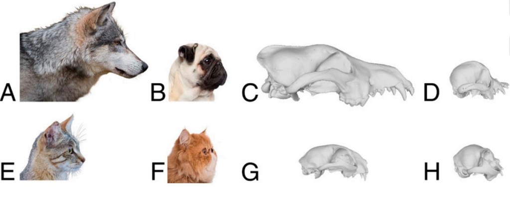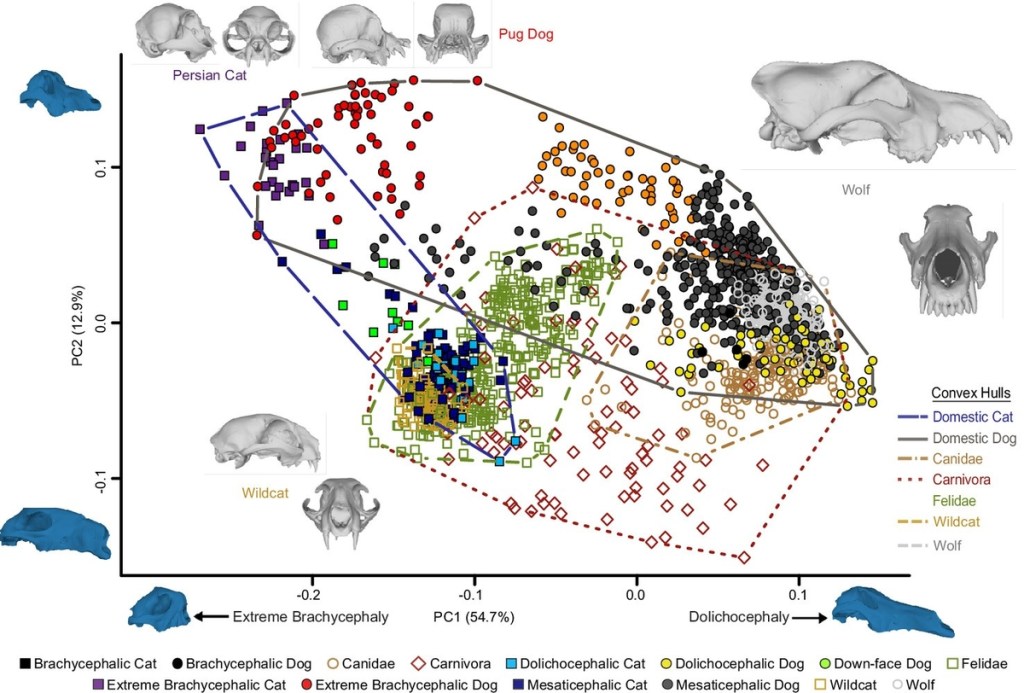 연구팀은 고양잇과와 갯과를 포함한 육식목(Carnivora) 동물 1,810개 두개골을 3D 스캔해, 47개의 형태적 특징을 정밀 분석했다. 퍼그와 페르시아고양이는 각각 다른 조상에서 출발했지만, 같은 종 내의 다른 품종이나 본래 조상들보다 서로 더 비슷한 두개골 형태를 공유하고 있었다.