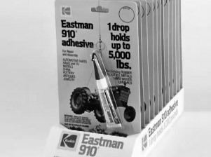 이후 1951년, 쿠버는 산업용 플라스틱 강도를 테스트하던 중 이 물질이 공기 중의 수분과 반응해 빠르게 경화되는 성질을 재발견했다. 이를 바탕으로 1958년, 이스트먼 코닥(Eastman Kodak)이 '이스트먼 910'이라는 이름으로 상업화하면서 순간접착제는 대중화되기 시작했다.