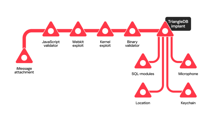 오퍼레이션 트라이앵귤레이션(Operation Triangulation)은 사용자의 조작 없이 iMessage 첨부파일을 통해 침투가 시작되고, WebKit과 커널의 취약점을 연속적으로 이용해 TriangleDB 백도어를 설치한다. 감염 이후에는 마이크, 위치 정보, 암호 저장소 등 주요 기능이 원격으로 수집되며, 감염 흔적은 기기 재부팅 시 자동으로 사라진다. [자료=Kaspersky Lab]