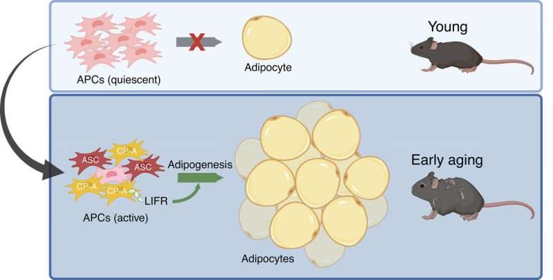 연구진은 또 RNA 단일세포 시퀀싱을 통해 노화된 APC가 CP-A(committed preadipocytes, age-specific)라는 새로운 형태로 전환되며 지방세포 분화를 촉진한다는 사실을 밝혔다. 특히 LIFR(leukemia inhibitory factor receptor) 신호 경로가 이 전환 과정에서 중요한 역할을 하는 것으로 나타났다.