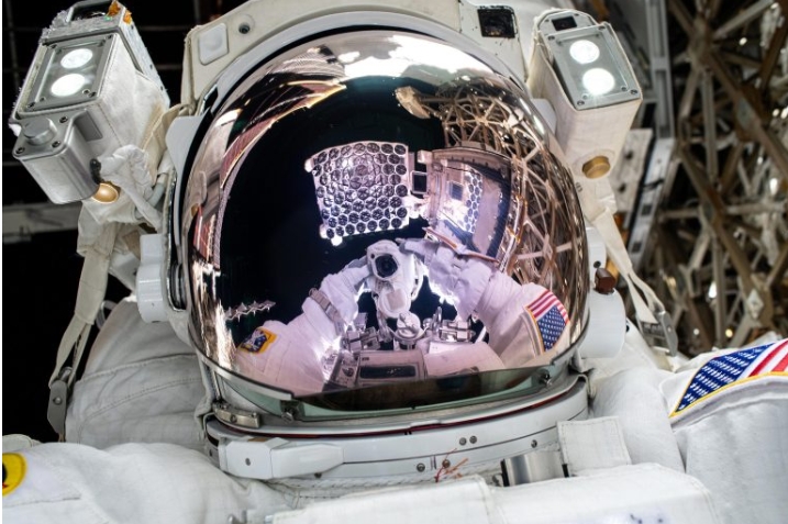 2025년 1월 16일, 우주 유영 중 촬영된 이 ‘우주 셀카’에는 NASA 우주비행사이자 72차 ISS 탐사 임무의 비행 엔지니어 닉 헤이그(Nick Hague)의 헬멧 바이저에 NICER X선 망원경이 반사되어 보인다.