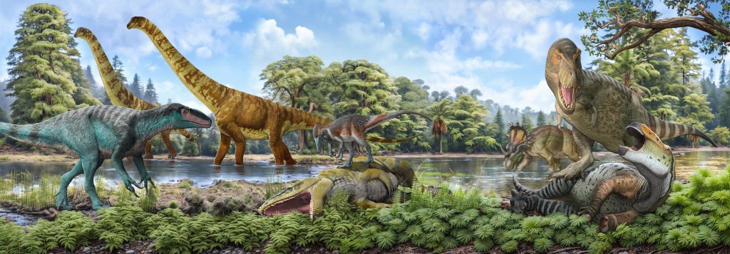 백악기 열극대 직후의 환경을 재현한 장면으로, 당시의 온난한 기후와 울창한 식생, 대형 초식 공룡의 생태를 묘사하고 있다. 약 9,200만 년 전 이 시기에는 기존의 거대 포식자인 카르카로돈토사우루스류가 멸종하고, 그 자리를 티라노사우루스류가 대체하게 된다. T. rex의 직계 조상은 이 시기를 전후해 아시아에서 북미로 이주했으며, 이후 냉각되는 기후 속에서 대형 포식자로 진화하게 된다. [사진=Science Wave]