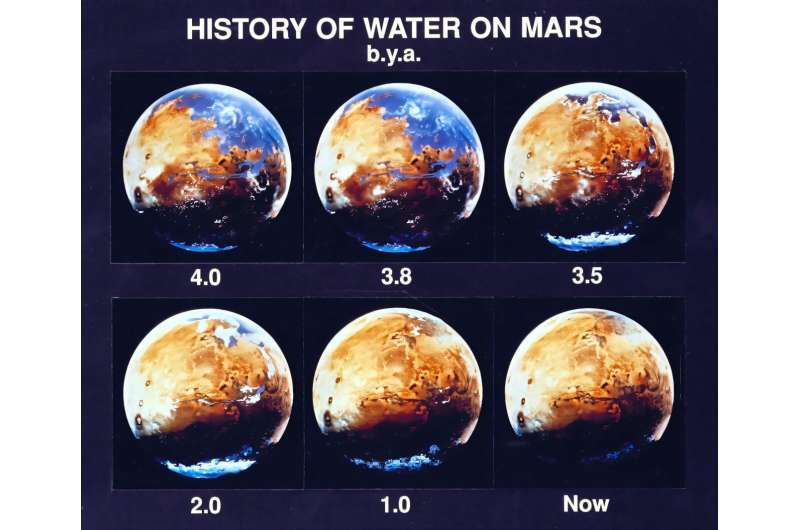 화성은 약 41억~30억 년 전 노아기(Noachian)와 헤스페리아기(Hesperian) 동안 강과 호수가 흐르던 시기를 거쳤다. 이후 자기장이 사라지고 대기가 희박해지면서 표면의 물은 대부분 사라졌고, 일부는 극지방의 얼음이나 광물 속에 갇힌 상태로 남았다.