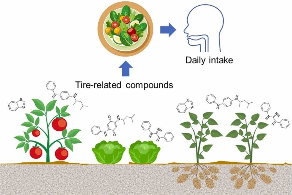 스위스 전역 유통 채소 100종을 분석한 결과, 6-PPD와 6-PPD-퀴논 등 타이어 첨가제가 31%의 시료에서 검출됐다. 유기농 여부, 판매처와 관계없이 나타났으며, 일부 성분은 설치류에서 생식 기능 저하와 신경 독성을 유발하는 것으로 보고됐다. 인체 대사 경로는 아직 확인되지 않았다.