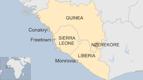 에볼라 바이러스 환자가 많이 발생하는 지역을 나타낸다.