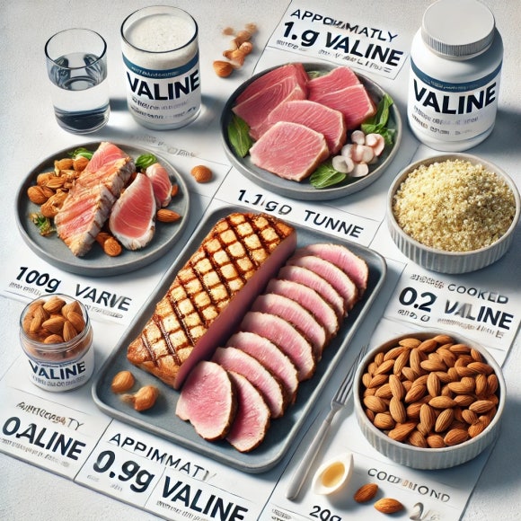 발린(Valine: 근육 회복, 에너지 공급)을 강화한 식단 예. 성인 기준 하루 약 15mg/kg(체중 60kg 기준 약 0.9g)의 권장 섭취량이 요구된다. 이는 돼지고기 100g(약 1.1g) 참치 100g(약 0.9g) 아몬드 28g(약 0.2g) 퀴노아 100g(약 0.3g)이다.