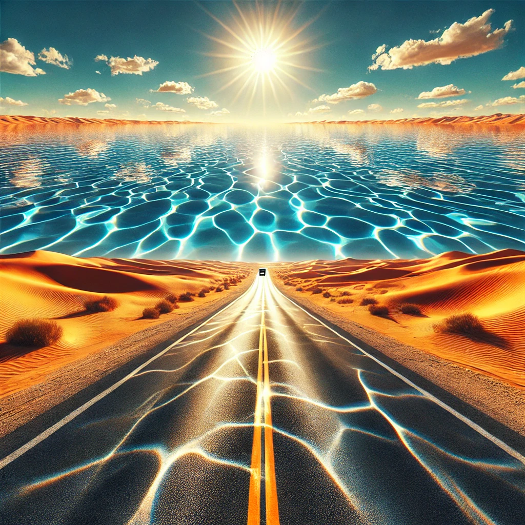 [사진=AI] 사막 도로 위에 신기루로 인해 물 웅덩이가 보이는 장면. 도로 위의 반사된 푸른빛이 실제로 존재하지 않는 물 웅덩이처럼 보이는 모습이다. (위 이미지는 신기루의 형성을 묘사한 예로, 빛의 굴절과 반사가 만들어내는 독특한 장면을 보여준다.)