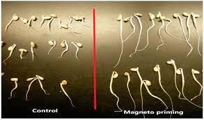 왼쪽은 자력의 영향을 받지 않은 대조(control) 조건이고, 오른쪽은 자력 증진(magneto-priming)이 이루어진 조건의 발아 상태이다.