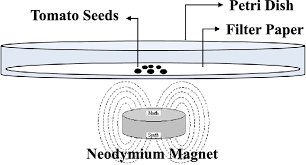 희토류 원소인 네오디뮴 자석의 영향을 받는 페트리디시 속의 토마토 씨앗이 발아하는 것을 관찰하는 실험 세트이다.