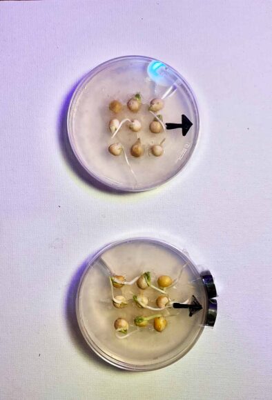 2. 자력이 미치지 않는 위 페트리디시 속에서 발아한 뿌리는 뻗은 방향이 일정하지 않다. 그러나 아래 페트리디시에서 발아한 뿌리는 자석을 향해 자라고 있고, 새싹은 뿌리 반대쪽을 향하고 있다.