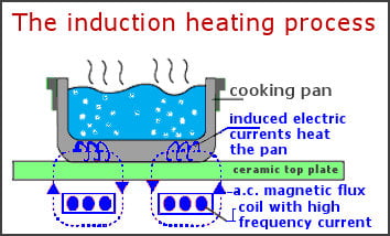 전자기 유도 가열 방법(the induction heating process)의 원리를 설명한다. cooking pan: 조리 냄비, induced electric currents heat the pan: 유도 전류가 냄비를 가열, ceramic top plate: 세라믹 식탁, a.c.magnetic flux coil with high frequency current: 고주파 교류로 자력장(자속)을 발생하는 코일