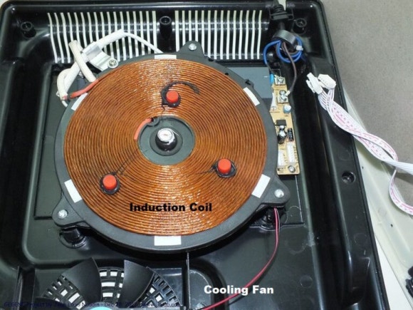 전자기 유도 스토브의 식탁 아래에 설치된 유도 코일(induction coil)의 모습이다. 이 코일에 전류가 흐르면 강한 자기장이 형성되어 세라믹 식탁(불판) 위에 놓인 냄비의 철판만 뜨거워지게 한다. 코일에서 발생하는 약간의 열은 냉각팬(cooling fan)을 통해 외부로 빠져나간다.